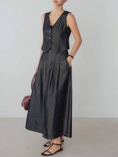 2Pcs Summer Women Business Casual Retro Washed Loose Vest & High Slit Skirt Set, Commuting Office Outfit With Creative Design Details-25%