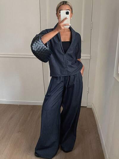 2pcs/Set Women Deep V-Neck Short Sleeve Denim Top And Elastic Waist Wide Leg Denim Pants, Casual Denim Outfit