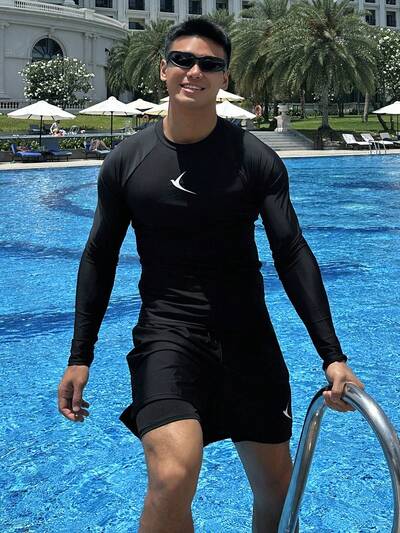Men's Letter Print Splice Sleeve Rash Guard, Slim Fit Swimwear For Summer-36%
