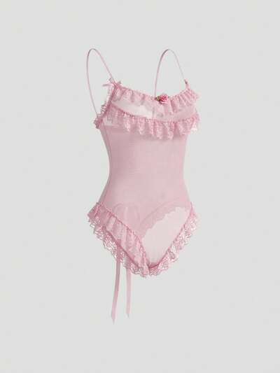 Lace & Mesh Patchwork Semi-Sheer Floral Decor Bodysuit, Fitted Spaghetti Strap Ruffle Trim Sexy Jumpsuit For Women-47%