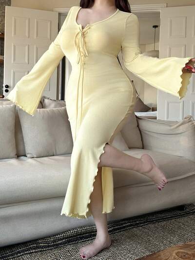 Dazy Plus Solid Color V-Neck Elastic Fitted Tie-Up Design Flare Sleeve Long Nightgown-39%