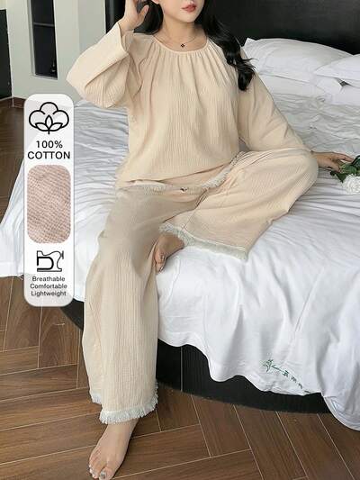 Dazy Plus Plus Size Women's Solid Color Scoop Neck Patchwork Fringe Loose Top And Long Pants Pajama Set, Spring/Summer-50%