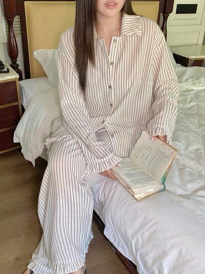 Dazy Plus 2pcs Striped Patchwork Ruffle Trim Casual Sleepwear Set, Plus Size Women Spring/Autumn, Fall & Winter Clothes-35%