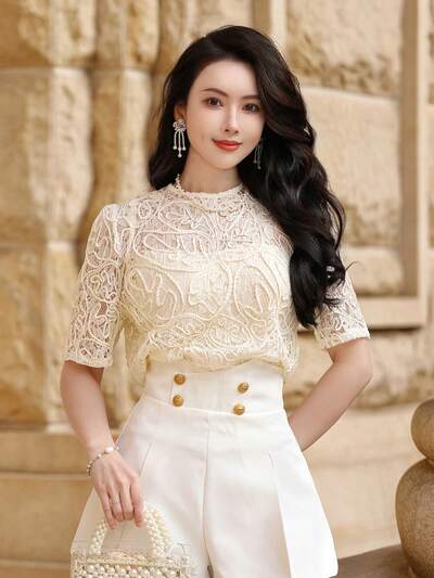 Women's Lace Patchwork Slim Fit Casual Elegant White Cardigan Shirt, Suitable For Spring And Summer, Valentine's Day, Wedding-43%