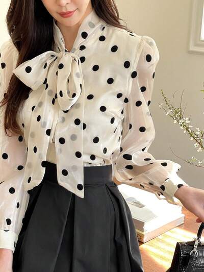 Women's Polka Dot Bow Ribbon Button-Down Shirt Long Sleeve Top-29%