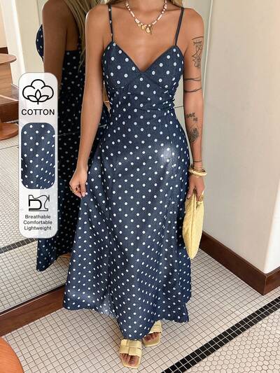 Women's Polka Dot Strap Dress, Elegant Denim Dress For Summer