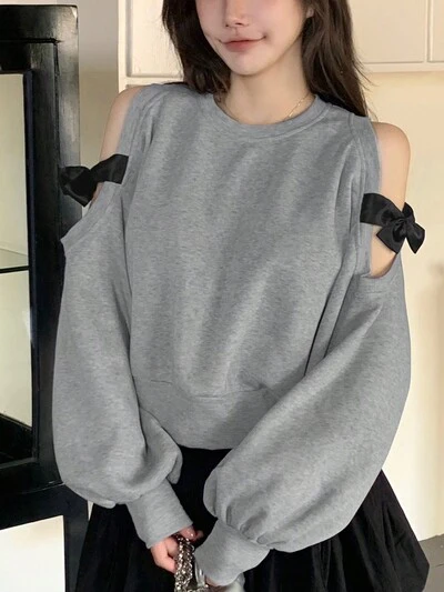 Women's Oversized Lace Pullover Sweatshirt With Cut-Out Shoulder Tie Bow Details,Long Sleeve Tops,Fall Women Clothes-72%