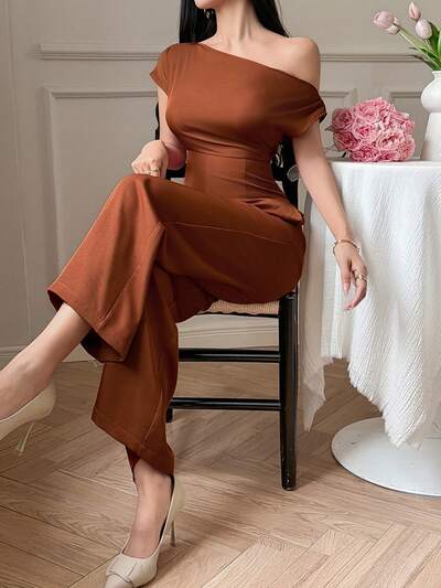 Women's Elegant Solid Color Asymmetrical Shoulder Wide Leg Jumpsuit, Summer Jumpsuit-63%