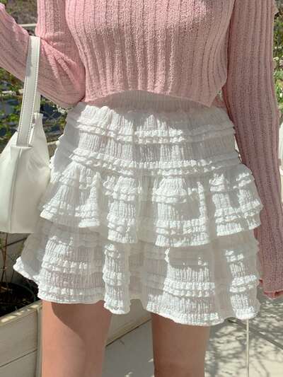 Women Lace Patchwork Short Skirt, Multi-Layer, White, Spring/Summer,Ruffle-51%