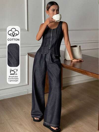 Women's Fitted Sleeveless Top With Seam Detail And Casual Jeans Pants Set-46%