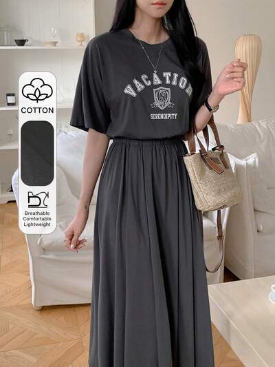 Letter Print Loose Waist Short Sleeve Dress For Women Maxi Dress-44%