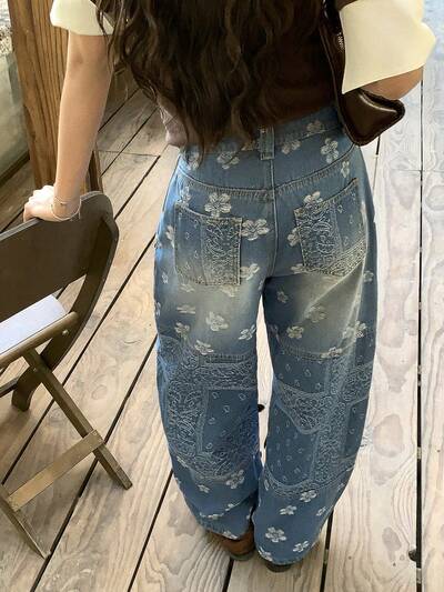 2pcs Women's Casual Business Loose Denim Outfit, Vintage Washed Plain Color Straight Leg Jeans Jacket And Pants Set With Contrast Stitching Decoration, Autumn/Winter,Fall Women Clothes