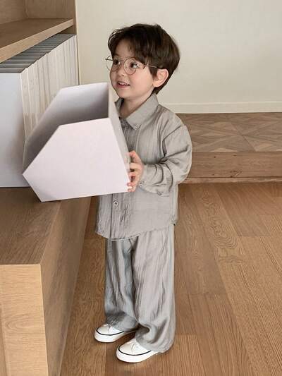 Toddler Boys' Fashion Shirt Set, Korean Style Casual Outfit, Grey, Lightweight Shirt Top And Wide Leg Pants 2-Piece Set, Spring/Summer/Autumn-55%
