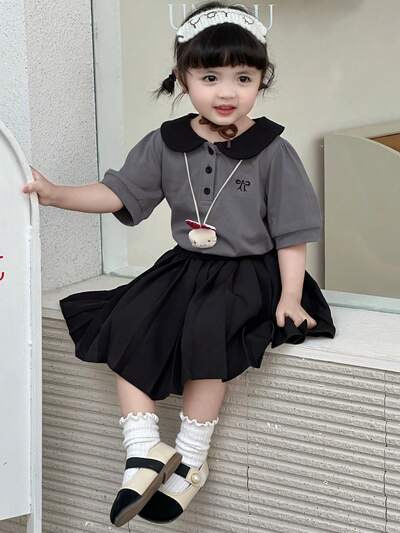 Baby Girl Polo Collar Casual Cartoon Embroidered Color Block Short Sleeve Top, For Back To School Toddler Girls Clothes-43%