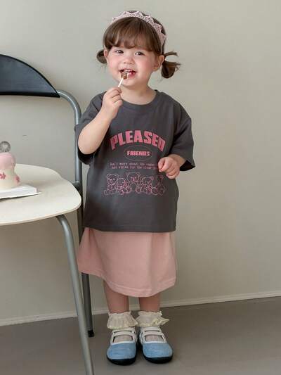 Baby Girls' Casual Loose Fit Cartoon Letter Print Round Neck Top, Korean Style Summer Toddler Girls Clothes-52%