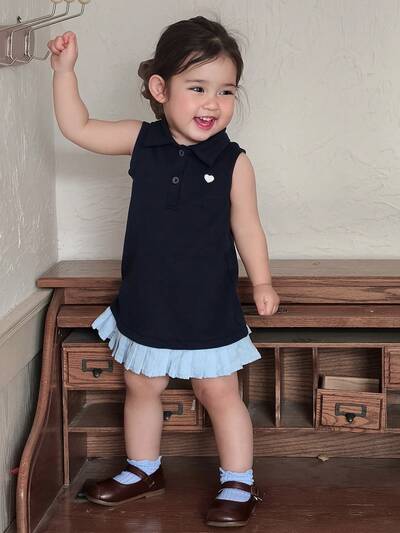Baby Girls' Casual Sleeveless Dress With Collar, Contrast Color And Ruffle Hem Summer Toddler Girls Clothes-44%
