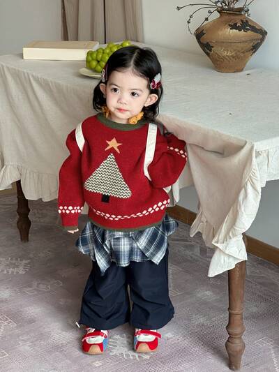 Toddler Girls' Round Neck Christmas Atmosphere Knit Sweater, Korean Style, Autumn/Winter-43%
