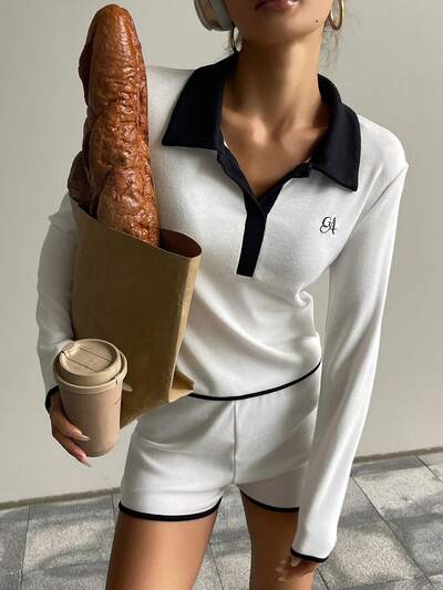 2pcs/Set Knitted Collared Fitted Short Sleeve Top And Shorts Set, Casual Women Outfit Pajama-60%
