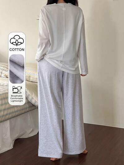 Minimalist Solid Color Loose Long Sleeve T-Shirt Top & Plaid Straight Loose Pajama Pants Homewear Set, Winter Clothes-60%