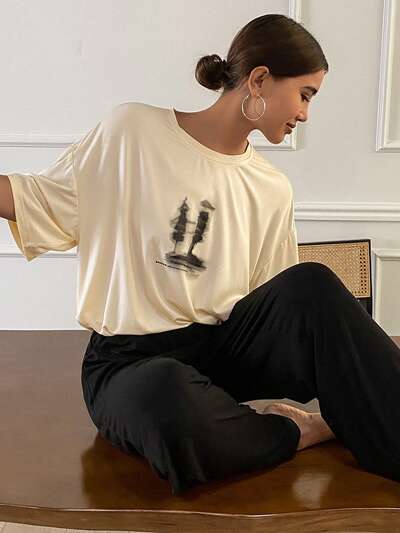 Simple Printed Loose Fit T-Shirt And Loose Sleepwear Pajamas Set For Home