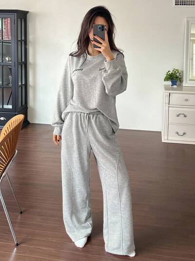 Comfortable Knit Fleece Fabric Simple English Embroidery Decor Long Sleeve Top & Pants Loungewear Set Fall, Winter Clothes , Cozy-18%