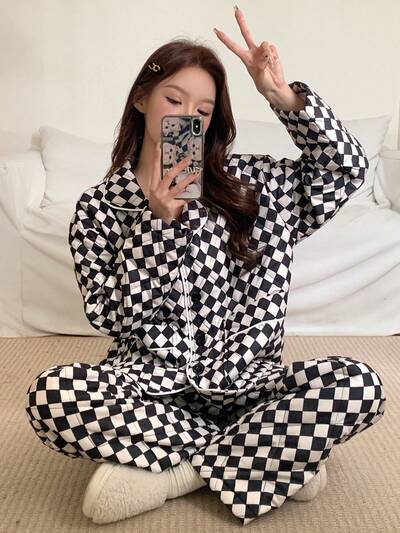 2pcs Thick -Padded Floral Homewear Set Fall,Winter Pajama-18%