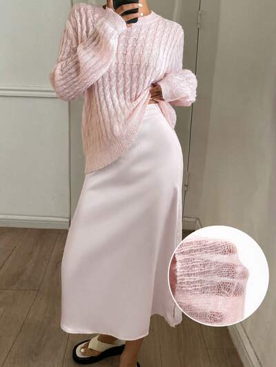 2pcs/Set Women Knitted Loose Long Sleeve Top And Long Skirt Casual Outfit, Spring-60%