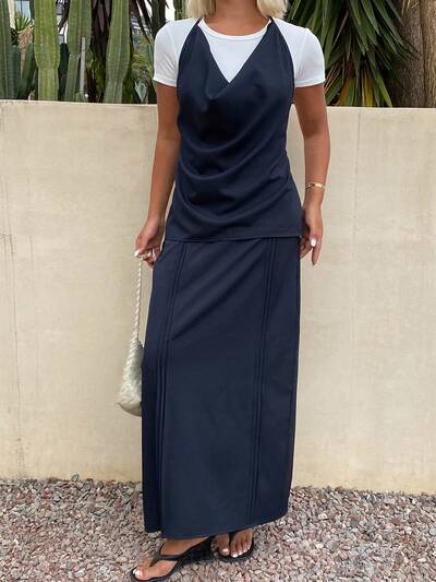 Women's Solid Color Halter Tie Back Sleeveless Top And Pleated Long Skirt Casual Summer 2-Piece Set Lounge Sets For Women-48%