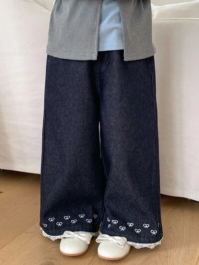 Young Girls Water-Washed Korean Style Flared Bowknot Embroidered Letter Casual Jeans