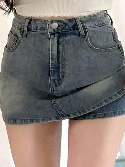 Distressed Denim Wrap-Around Bodycon Safety Shorts Skirt, Spring/Summer-44%