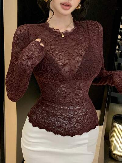 1pc Women's Solid Color Fitted Lace Undershirt, Elegant Long Sleeve Top For Autumn/Winter-33%