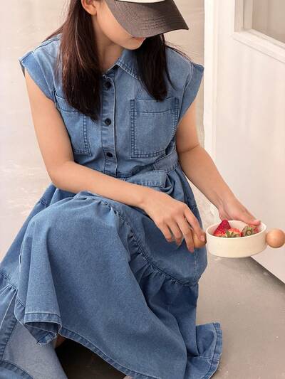 Tween Girls Denim Collared Short Sleeve Dress Summer-54%