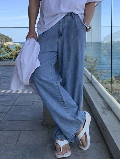 Men's Loose Fit Wide Leg Washed Jeans, Solid Color, Autumn-22%