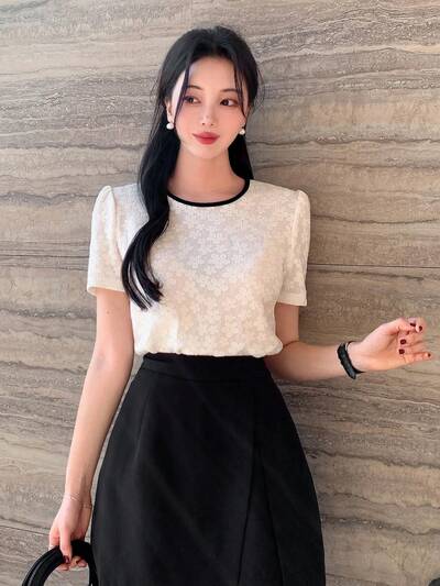 Spring & Summer Design Pleated Deep V-Neck Hollow Floral Lace Patchwork Blue Blouse, Elegant Casual Vacation Beach Chiffon Shirt With Cinched Waist, Sheer Mesh Short Sleeve Top For Women