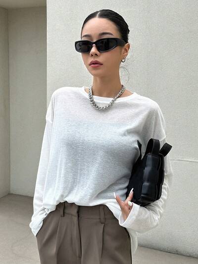 Solid Drop Shoulder Top,Ladies Casual Drop Shoulder Round Neck Loose White Plain Women Tops,Spring/Fall,Casual Daily Wear Long Sleeve Women Tops-44%