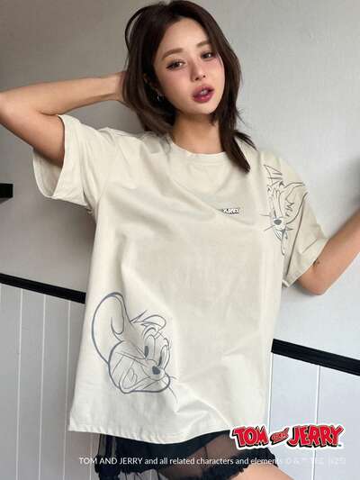 TOM AND JERRY X DAZY Casual Loose Round Neck Cartoon Print Short Sleeve T-Shirt For Women Graphic Tee, Teacher-38%
