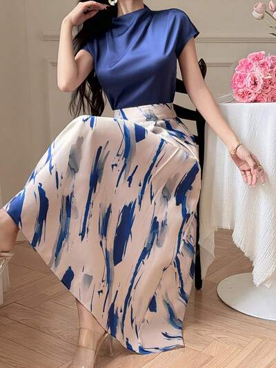 Women's Elegant Solid Color Draped Neck Top And Contrast Floral A-Line Skirt 2 Piece Set, Summer-40%