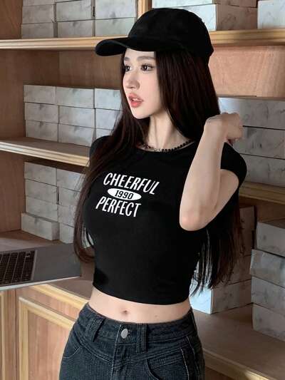 Letter Printed Round Neck Short Sleeve Crop Top T-Shirt Preppy Tops-44%