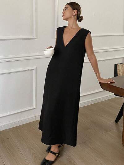 Women Loose Solid V-Neck Sleeveless Black Long Dress Sundress,Fall Clothes-36%