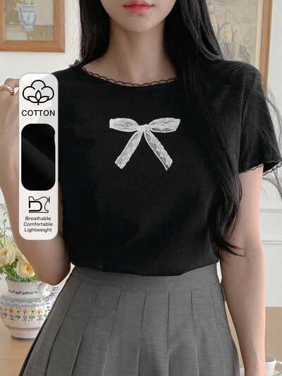 Lace Floral Bowknot Pattern Printed Round Neck Short Sleeve Women's T-Shirt Summer Cute Tops-36%