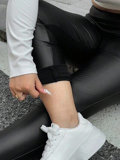 Dazy Plus Plus Size Women Faux Leather & Mesh Patchwork Elastic Skinny 7/8 Length Pants, Thick Thermal Lining, Street Style Fall-28%
