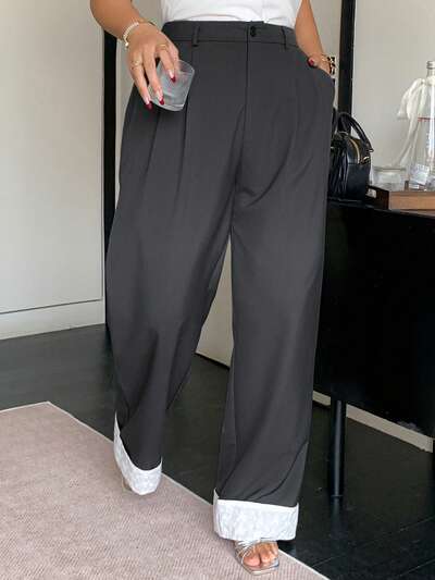 Dazy Plus Plus Size Solid Color Casual Contrast Lace Straight Leg Long Pants,Women Dress Pants-75%