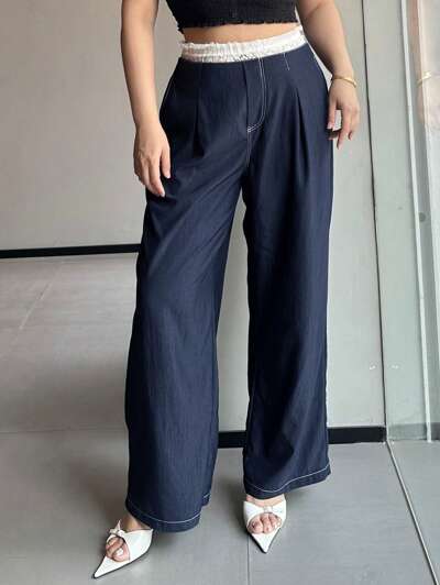 Dazy Plus Elastic Waist Drawstring Loose Straight Leg Casual Plus Size Women Pants, Street Style, All Season-55%