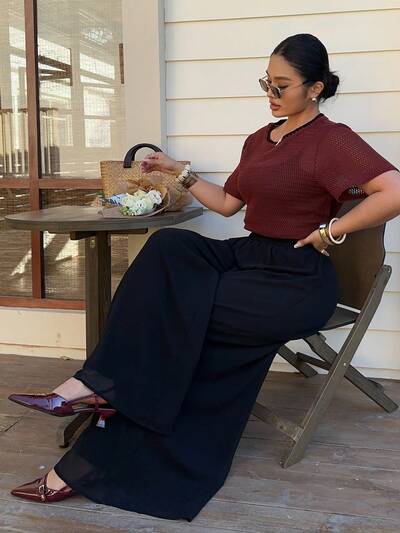 Dazy Plus Plus Size Women's Elastic Waist Chiffon Wide Leg Pants Culottes, Black, Spring/Summer-50%