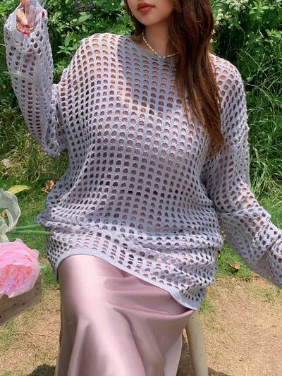 Dazy Plus Plus Size Mesh Crew Neck Long Sleeve Pullover Sweatshirt, Light Purple Mesh Shirt Vacation-60%