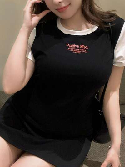 Dazy Plus Color Block Letter Print Tight Short Sleeve Summer T-Shirt-41%