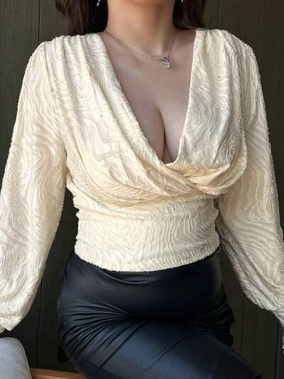 Dazy Plus Stretchy Fitted Elegant Party Short Long Sleeve Solid Beige T-Shirt, Versatile For Spring/Summer-72%