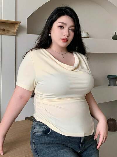 Dazy Plus Plus Size Solid Color Draped Neck Slim Fit Short Sleeve T-Shirt-60%