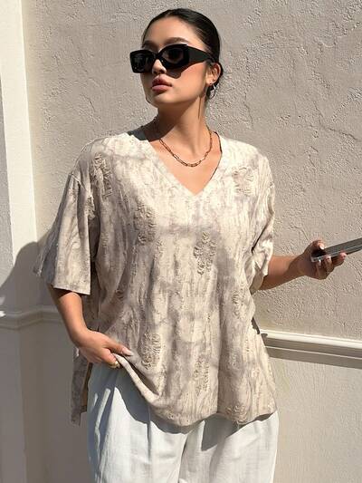 Dazy Plus Distressed V-Neck Loose Short Sleeve Plus Size Women T-Shirt, Street Style, Spring/Summer-32%