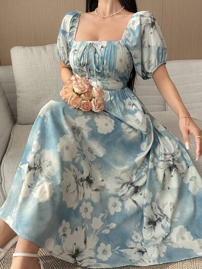 Women's Elegant Floral Print Square Neck Dress Boho-60%